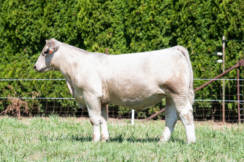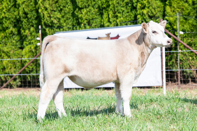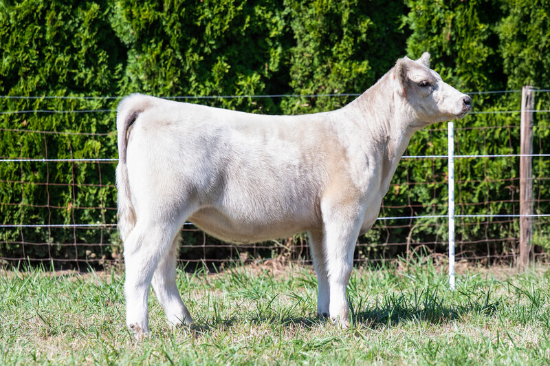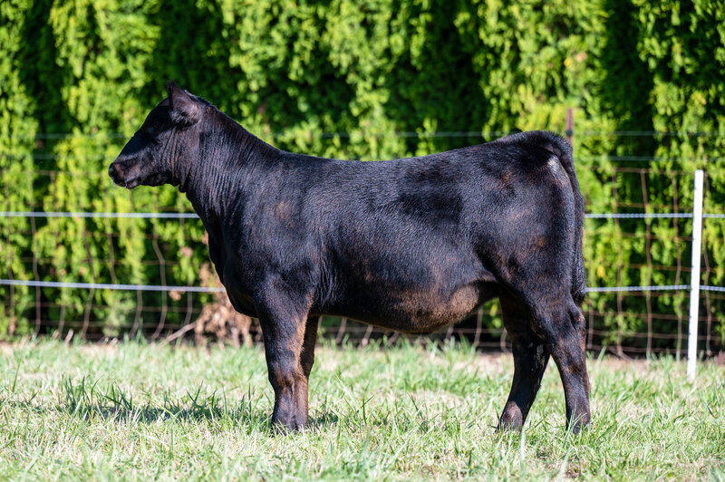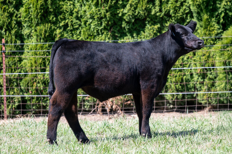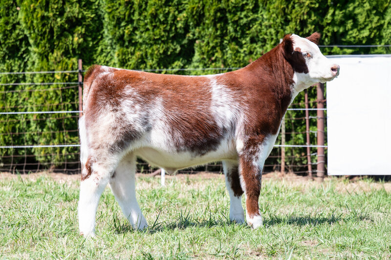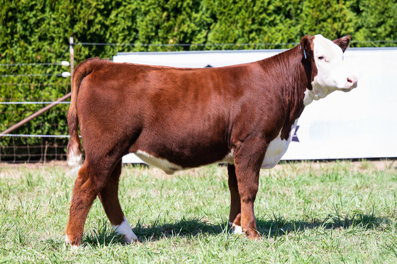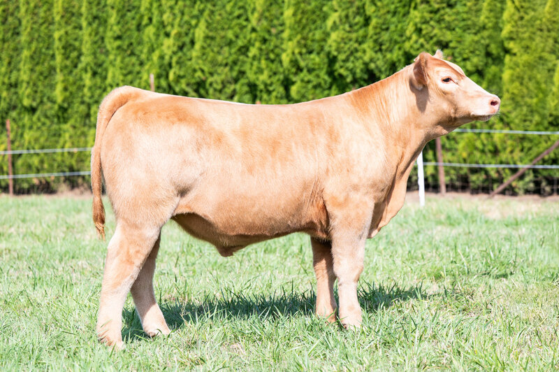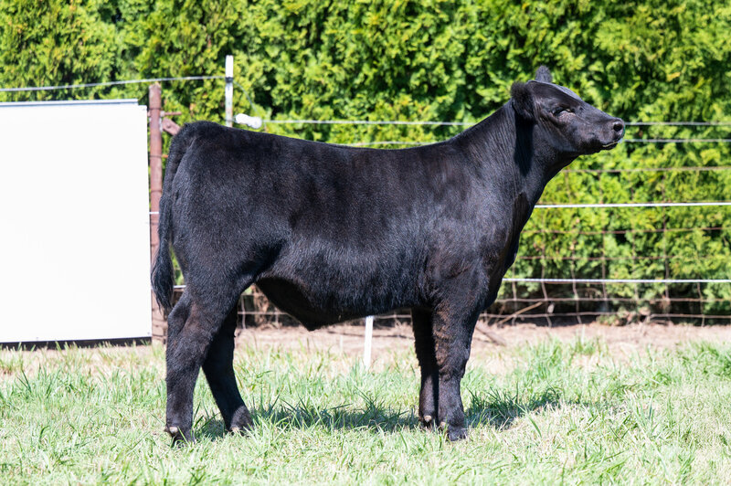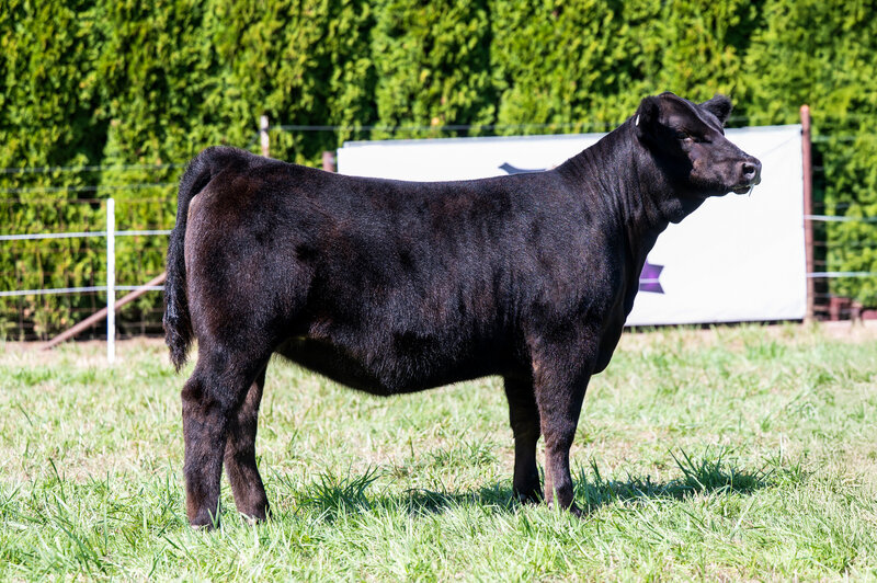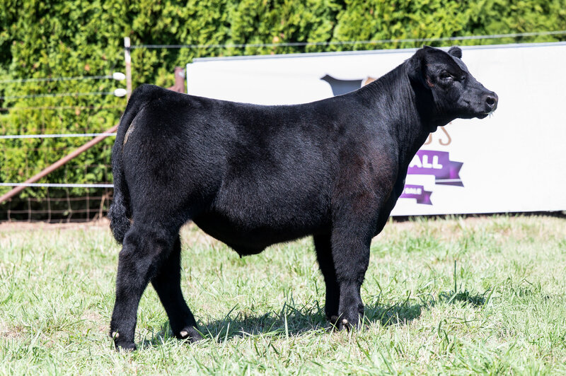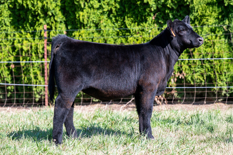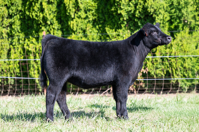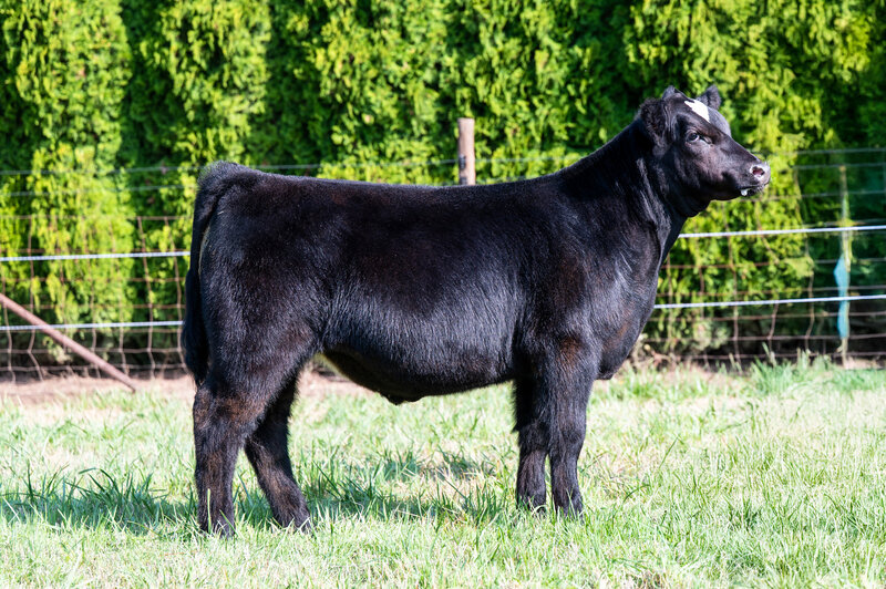When you look at the offering of heifers this year, you’ll clearly see this is the biggest bodied female with a tremendous amount of rib shape. She is deep and stout featured. She has a massive hip and hind leg. She’s opened up and her stoutness is sure impressive! This heifer is broody and sound footed. She is sure to be a contender in the show ring, but with the top shape she has, her real future is being a show steer maker. She is the cow power heifer of the sale!