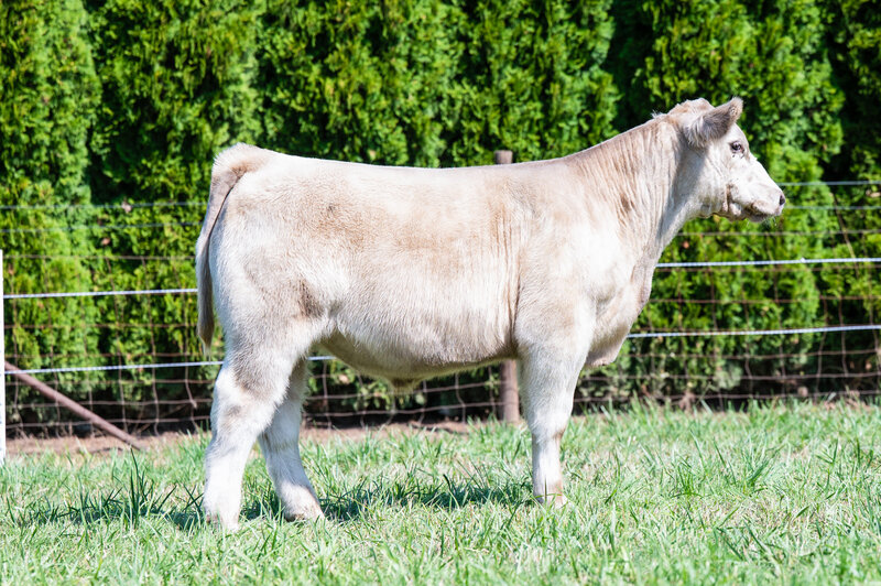 Another showstopper out of the barns of Grace Cattle. This stud is a purebred Simmi out of a Broker/Relentless female that Grace Cattle purchased this past year from Shaake, and he was born to set the bar high! You can’t draw a steer much better than this one from the side! Square and level, long fronted, good boned and extremely sound. He is great haired and easy going. Take this one home, get him to a show, and it’s likely you’ll find yourself in front of a backdrop holding a banner!